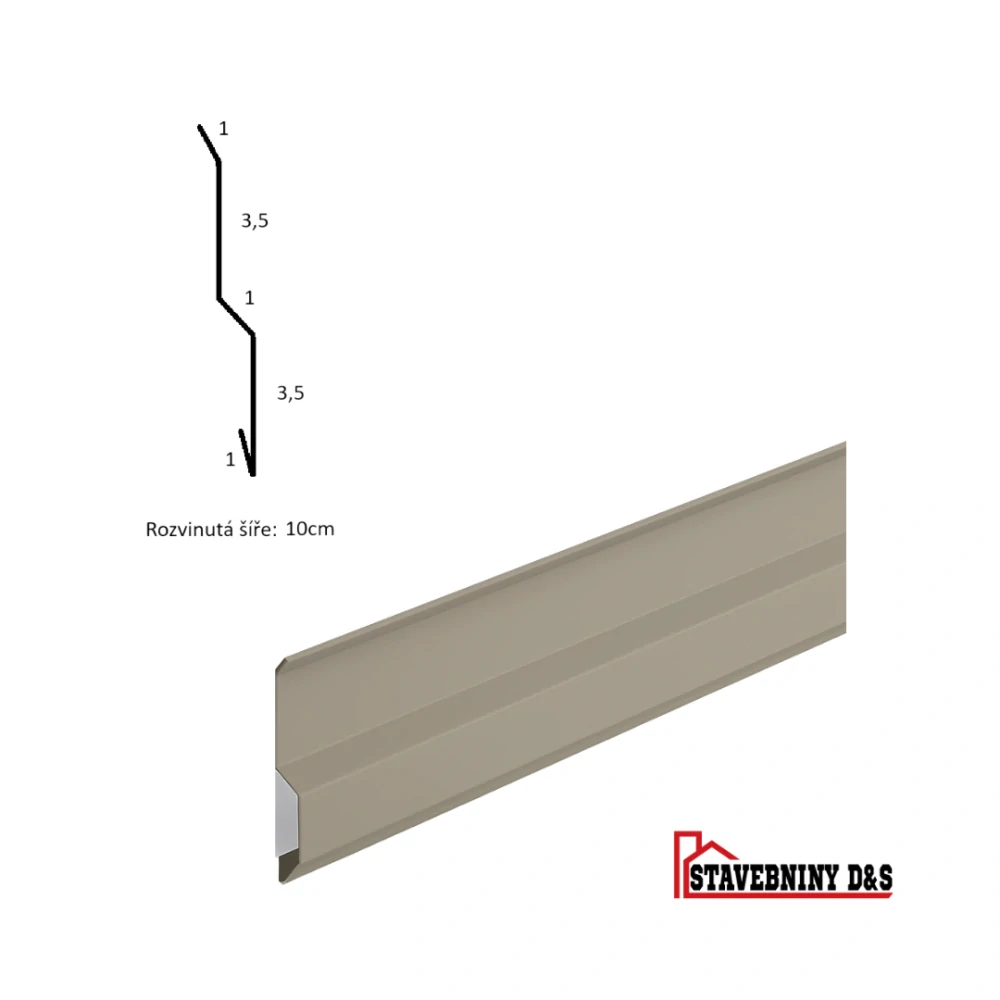 Krycí lišta s rozvinutou šířkou 10 cm je univerzální klempířský prvek určený k překrytí spojů, přechodů nebo dilatačních mezer mezi stavebními prvky. Používá se například při zakončení oplechování, překrytí spár mezi zdivem, oplechováním, parapety nebo u detailů střechy. Lišta poskytuje nejen funkční ochranu proti zatékání, ale i estetické zarovnání detailu.
