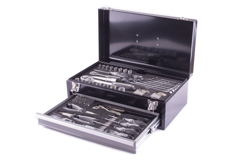 - dílenský kovový kufr o rozměru 44 x 24 x 16,5cm - 2 vrstvy nářadí, materiál: karbonová ocel, CrV - 1/2 hlavice 7ks: 10, 13, 14, 15, 16, 17, 19mm - 1/2 prodlužovací nástavec 125mm - 1/2 ráčna - 1/4 hlavice 8ks: 6, 7, 8, 9, 10, 11, 12, 13mm - 1/4 prodlužovací nástavec 50mm - 1/4 ráčna - adaptér ráčna 1/4 na bit - 50ks bitů 25mm + nástavec - klíč očkoplochý 7ks: 8, 9, 10, 13, 14, 17, 19mm - imbus 11ks: 1,27-1,5-2-2,5-3-3,5-4-4,5-5-5,5-6mm - torx 8ks: T9, T10, T15, T20, T25, T27, T30, T40 - šroubováky 6ks: 3x75, 5x100, PH1x75, PH2x100, PZ1x75, PZ2x100 - kleště SIKO 250mm (tlačítkové) - kleště kombi 180mm, kleště rovné 150mm