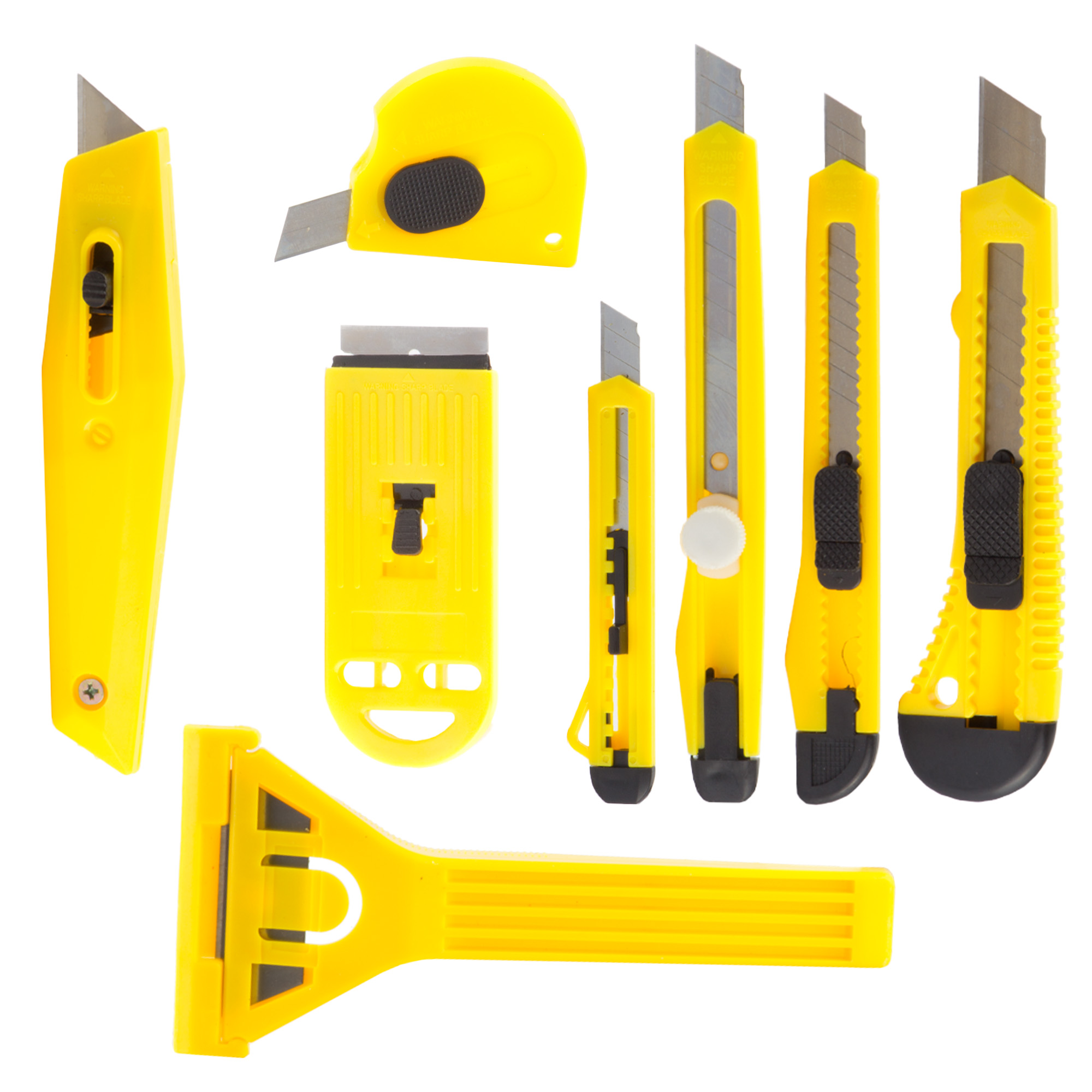 - řezák na karton - škrabka na sklo (břit 4cm) - škrabka na sklo (břit 5cm) - nůž plastový výsuvný - nůž odlamovací (břit 18mm) - 3 ks nůž odlamovací (břit 9mm)