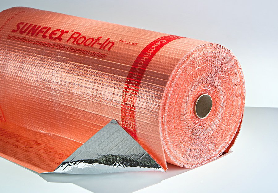 SUNFLEX ROOF-INParotěsná reflexní folie SUNFLEX ROOF-IN v sobě kombinuje vlastnosti parotěsné folie, tepelné izolace a reflexních účinků. Je vyrobena laminací reflexní hliníkové vrstvy na bublinkovou fólii. Hliníková vrstva odrazí až 95 % tepelného záření zpět do místnosti. Reflexní vrstva spolu se vzduchovými polštářky bublinkové fólie a vzduchovou mezerou mezi fólií a vnitřním obkladem působí jako dodatečné izolace nahazující až 5 cm minerální vaty (tepelný odpor vrstvy s 3 cm vzduchovou mezerou je 1,1 m2 k/W). Aplikací fólie se odstraní tepelné mosty mezi izolací a krokvemi.